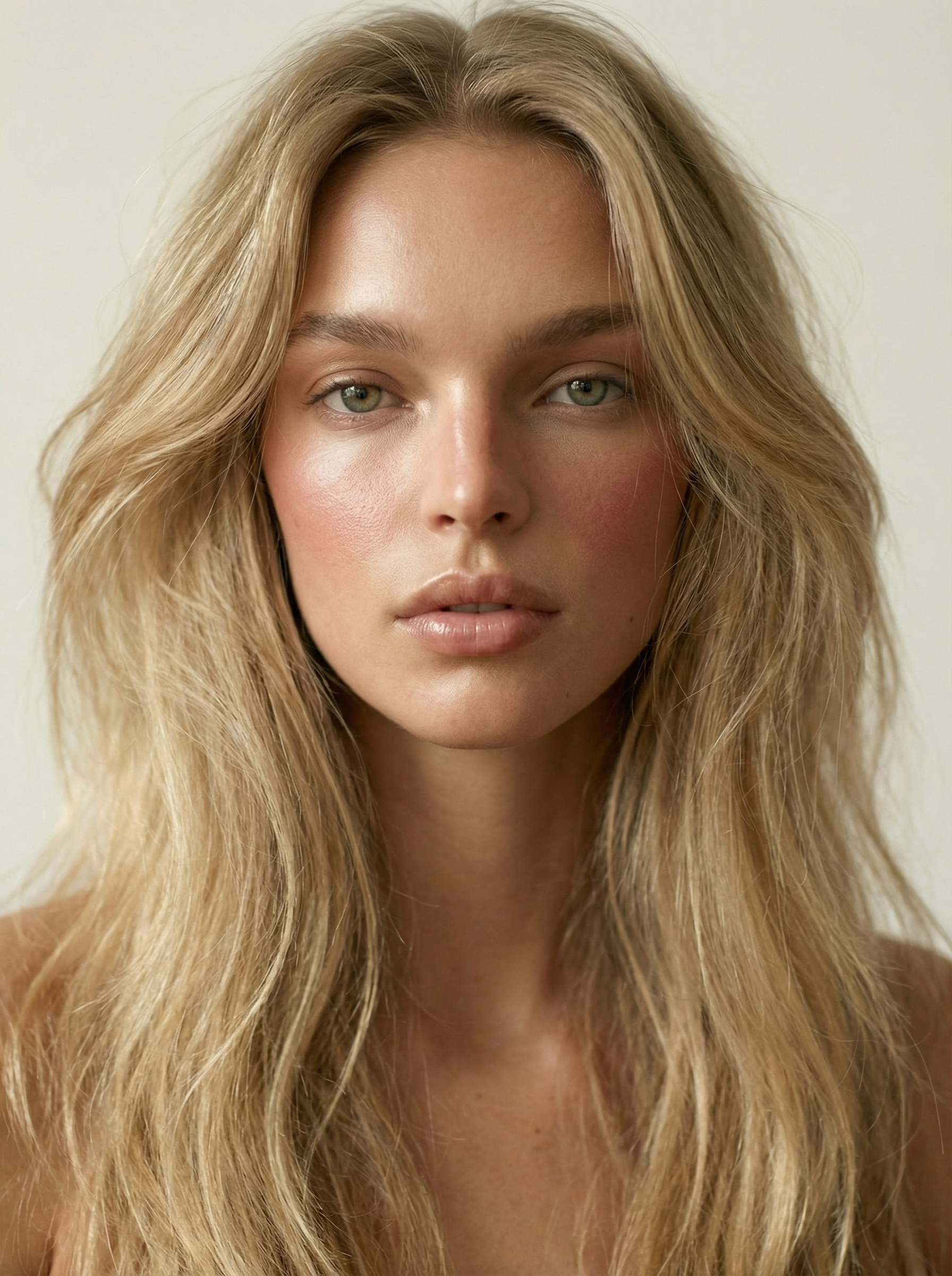 Форма лица: Мягкий овал. Тон кожи: Светлый тёплый бежВолосы: Тёмный блонд, длинные, натуральная текстура. Глаза: Светло-серо-зелёные, миндалевидные